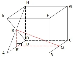 $.\: \: \: \qquad\begin{aligned}\textrm{QR}&=...(\textrm{gunakan rumus Pythagoras}\\ &\textrm{pada segitiga qR'R, yaitu}:)\\ \textrm{QR}^{2}&=\textrm{(QR')}^{2}+\textrm{(R'R)}^{2}\\ &\bullet \: \: \textrm{dengan QR'}=sisi\: \: kubus=8\: cm\\ &\bullet \: \: \textrm{R'R}=\displaystyle \frac{1}{2}.\textrm{sisi kubus}=\frac{1}{2}\left ( 8 \right )=4\: cm\\ \textrm{seh}&\textrm{ingga panjang QR dapat dihitung, yaitu:}\\ \textrm{QR}^{2}&=\textrm{(QR')}^{2}+\textrm{(R'R)}^{2}\\ \textrm{QR}&=\sqrt{\textrm{(QR')}^{2}+\textrm{(R'R)}^{2}}\\ &=\sqrt{8^{2}+\left ( 4 \right )^{2}}=\sqrt{64+16}=\sqrt{80}=\sqrt{16.5}\\ &=4\sqrt{5}\, \: cm\\ \end{aligned}$.